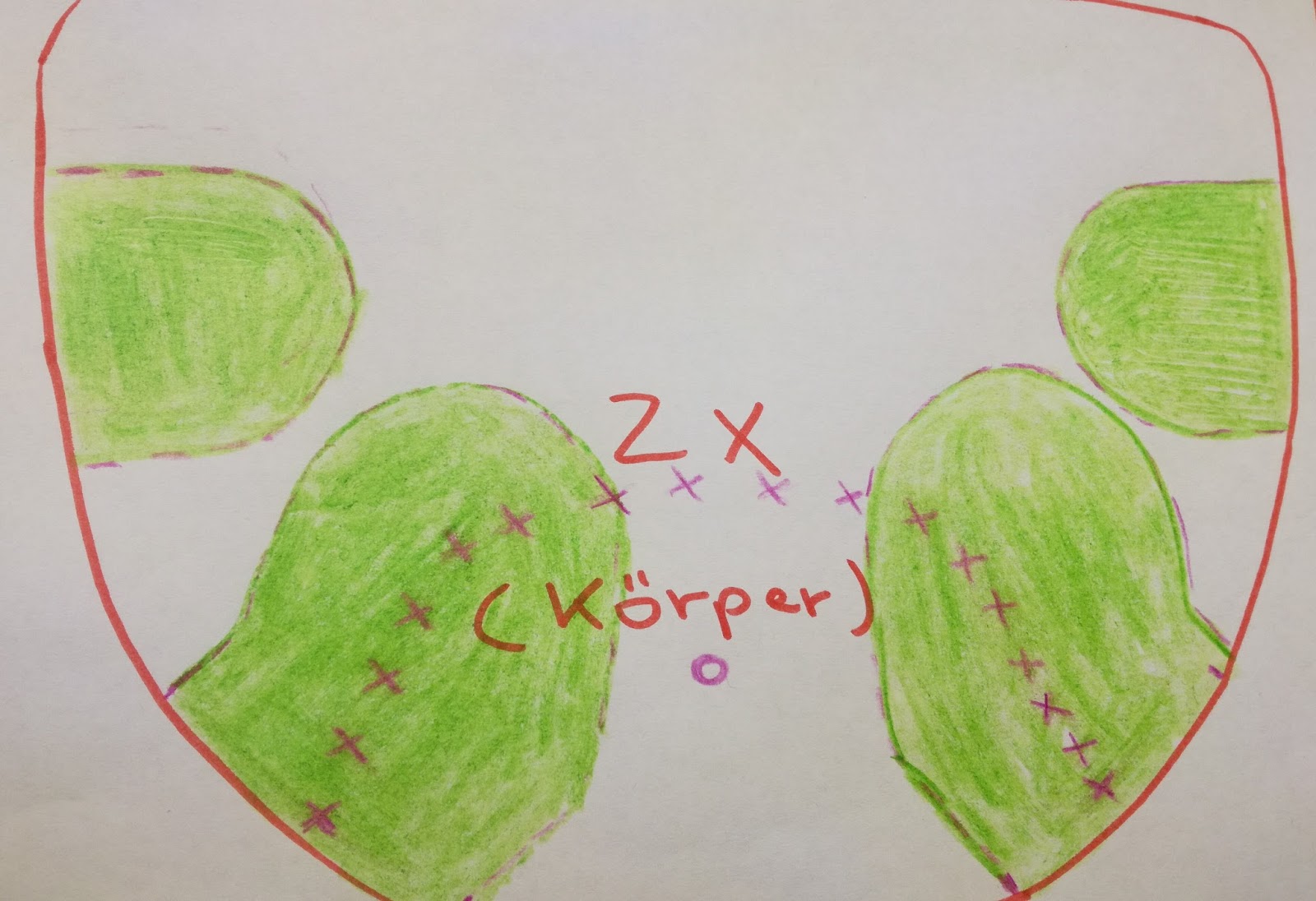 Jetzt lege die Ohren auf die rechte Seite des Vorderteil des Kopfes (das du vorher bereits genäht hat), an die Stelle, wo sie nachher sitzen sollen, nach innen gerichtet (siehe Skizze).